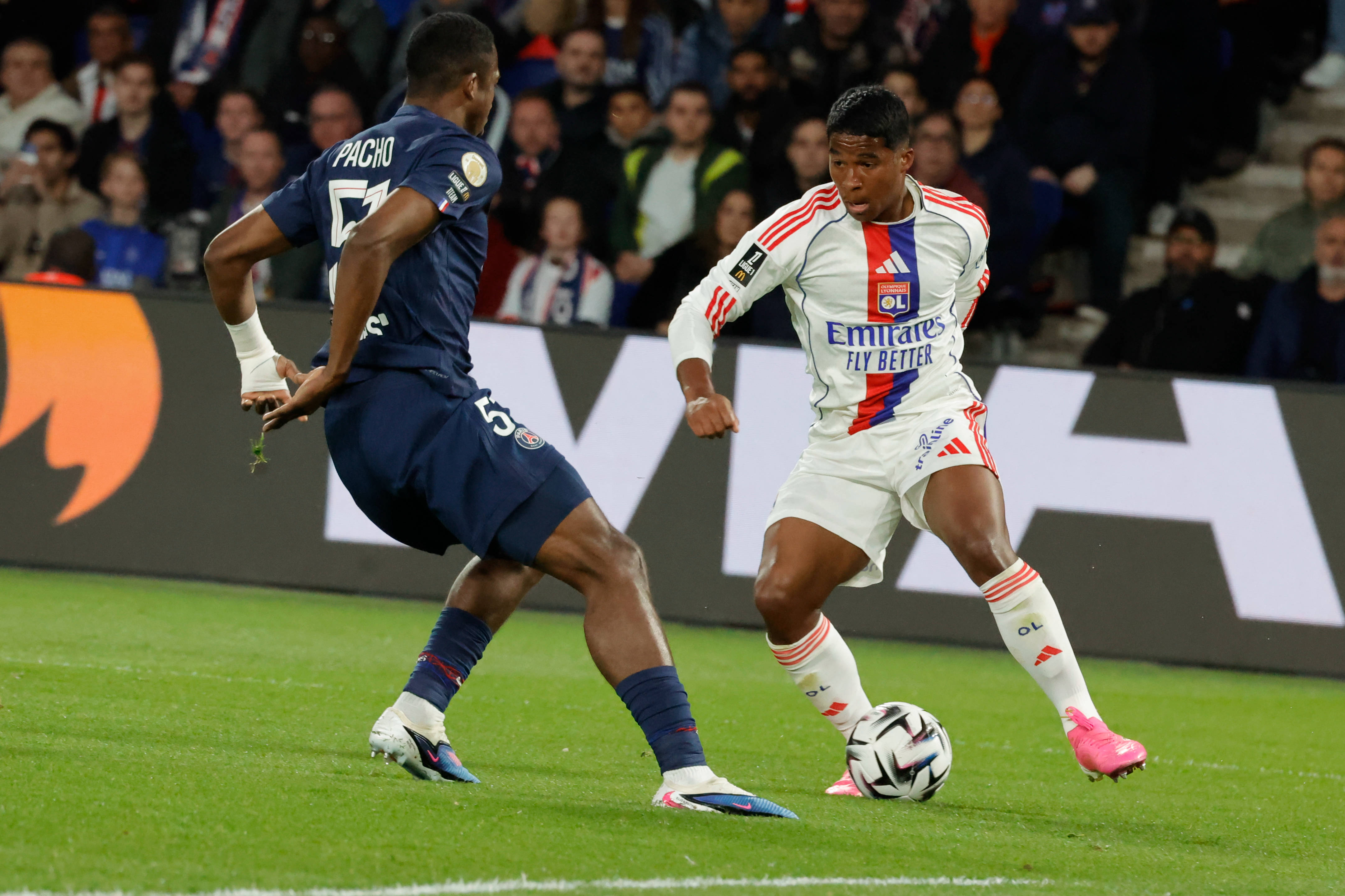 4月19日,巴黎圣日耳曼队球员阿什拉夫·哈基米(左)和里昂队球员恩德里克在比赛中拼抢。 新华社发(亨利·施瓦茨摄)